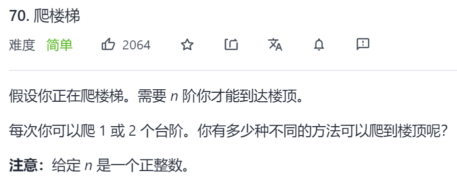 输入: 2输出: 2解释: 有两种方法可以爬到楼顶。1.  1 阶 + 1 阶2.  2 阶