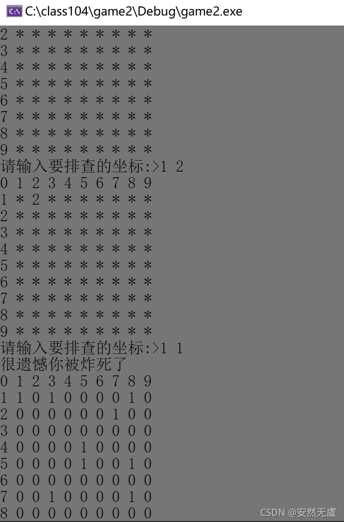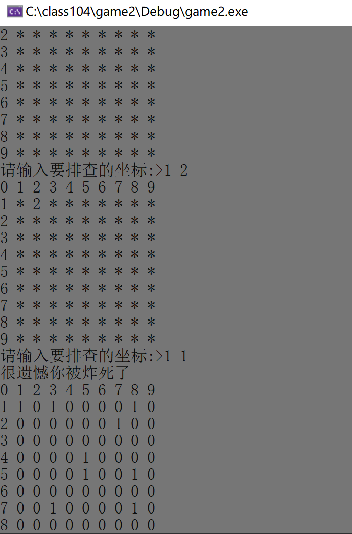 注意哦,需要初始化两个区域,一个用于存放布置好雷的信息,初始时用字符0;另外一个用于存放排查出雷的信息,初始时用字符*