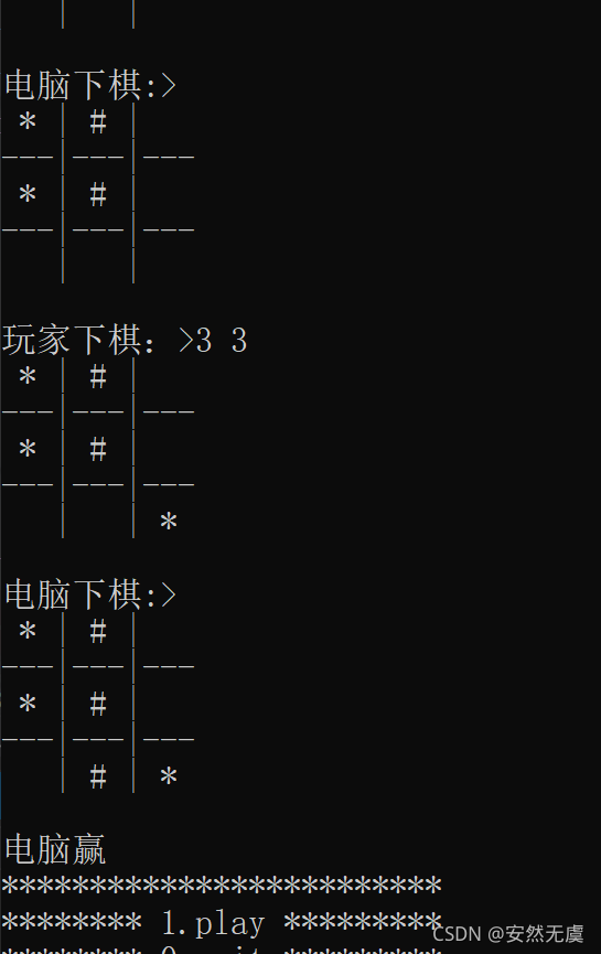 【注意】:因为行列已经指定0~2范围了,所以电脑下棋这部分就不用判断合法性了