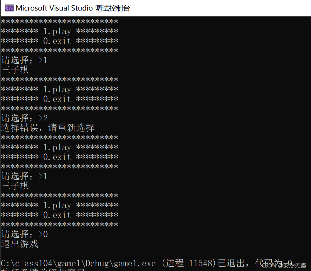 经过测试发现以上代码逻辑没有问题,我们只需要将“三子棋”那块内容封装成函数即可。