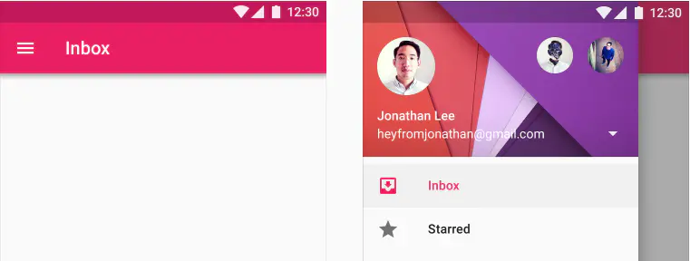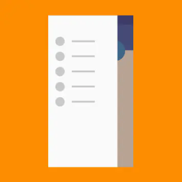 侧边抽屉从左侧滑出,占据整个屏幕高度,遵循普通列表的布局规则。手机端的侧边抽屉距离屏幕右侧56dp。