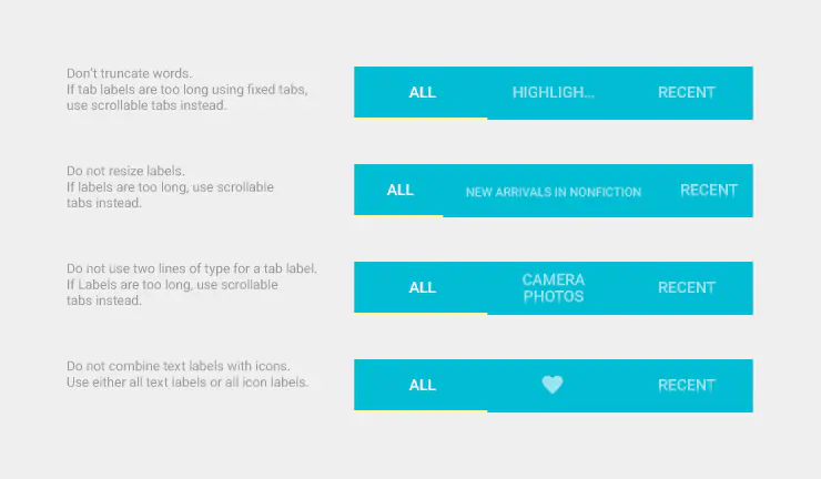 tab文字要显示完整,字号保持一致,不能折行,文字与图标不能混用。