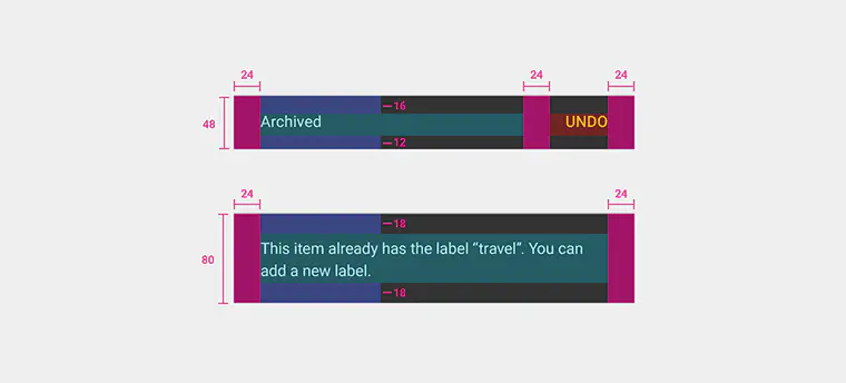 Snackbars的留白比较大,24dp。