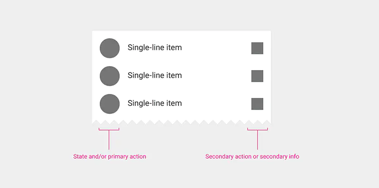 列表由单一连续的列构成,该列又等分成相同宽度称为行(rows)的子部分。行是瓦片(tiles)的容器。瓦片中存放内容,并且在列表中可以改变高度。