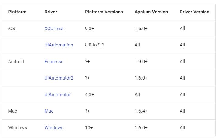 对于 Android、iOS 底层使用了不同的工作引擎驱动实现自动化测试。Appium 引擎列表: