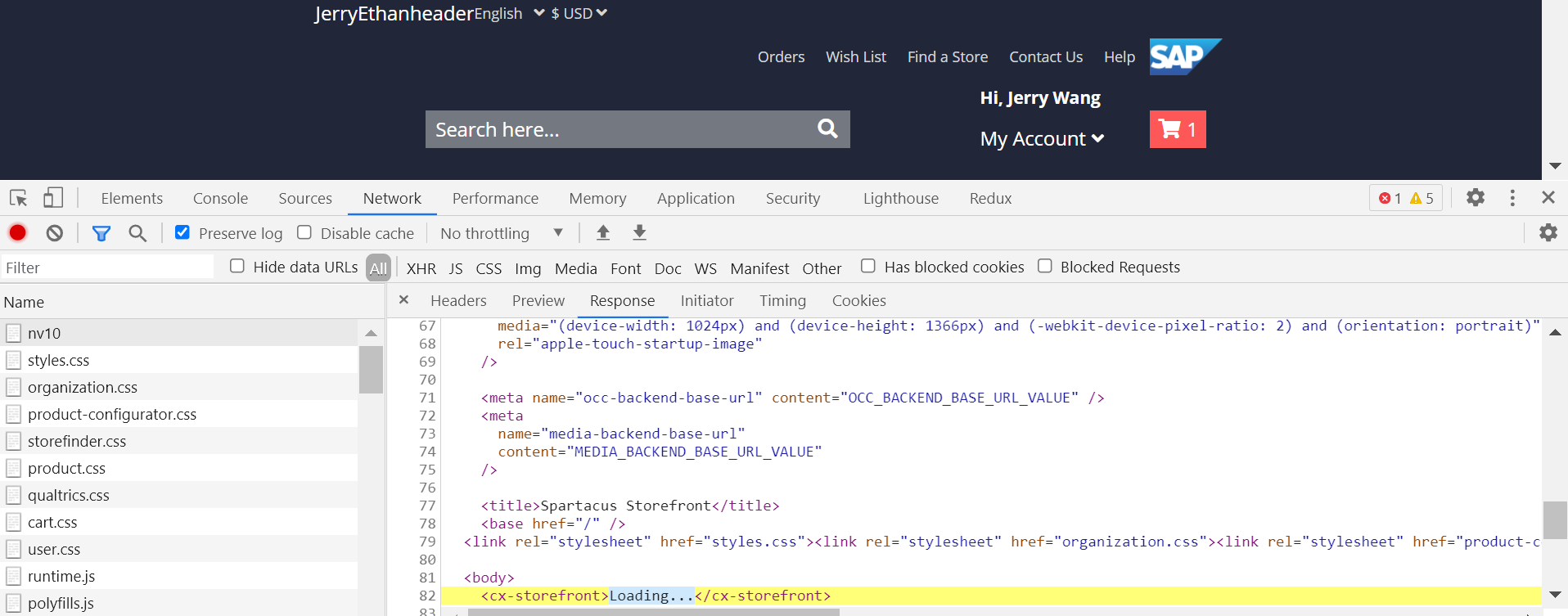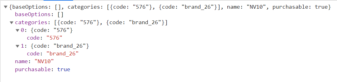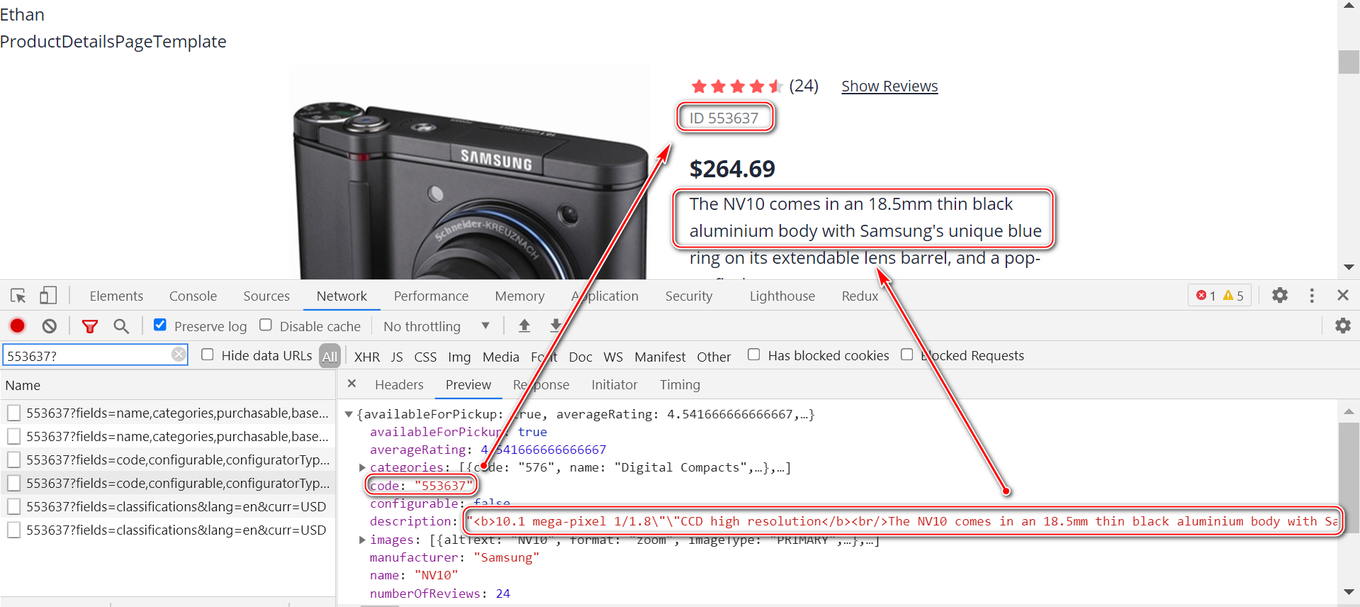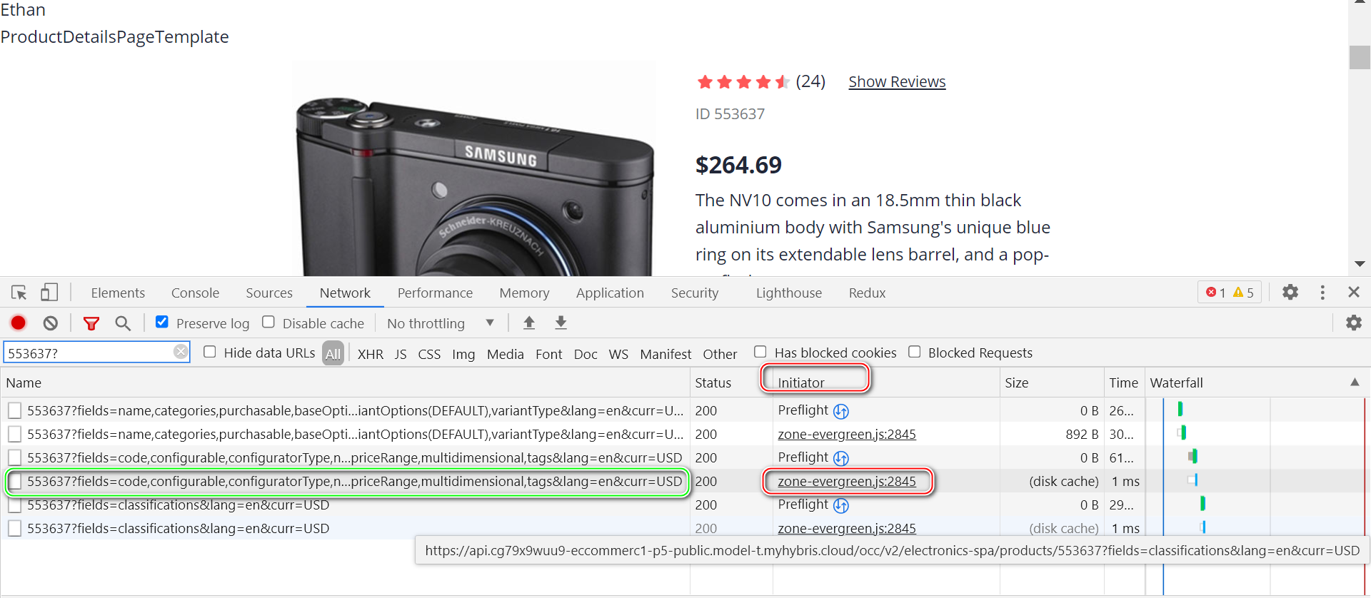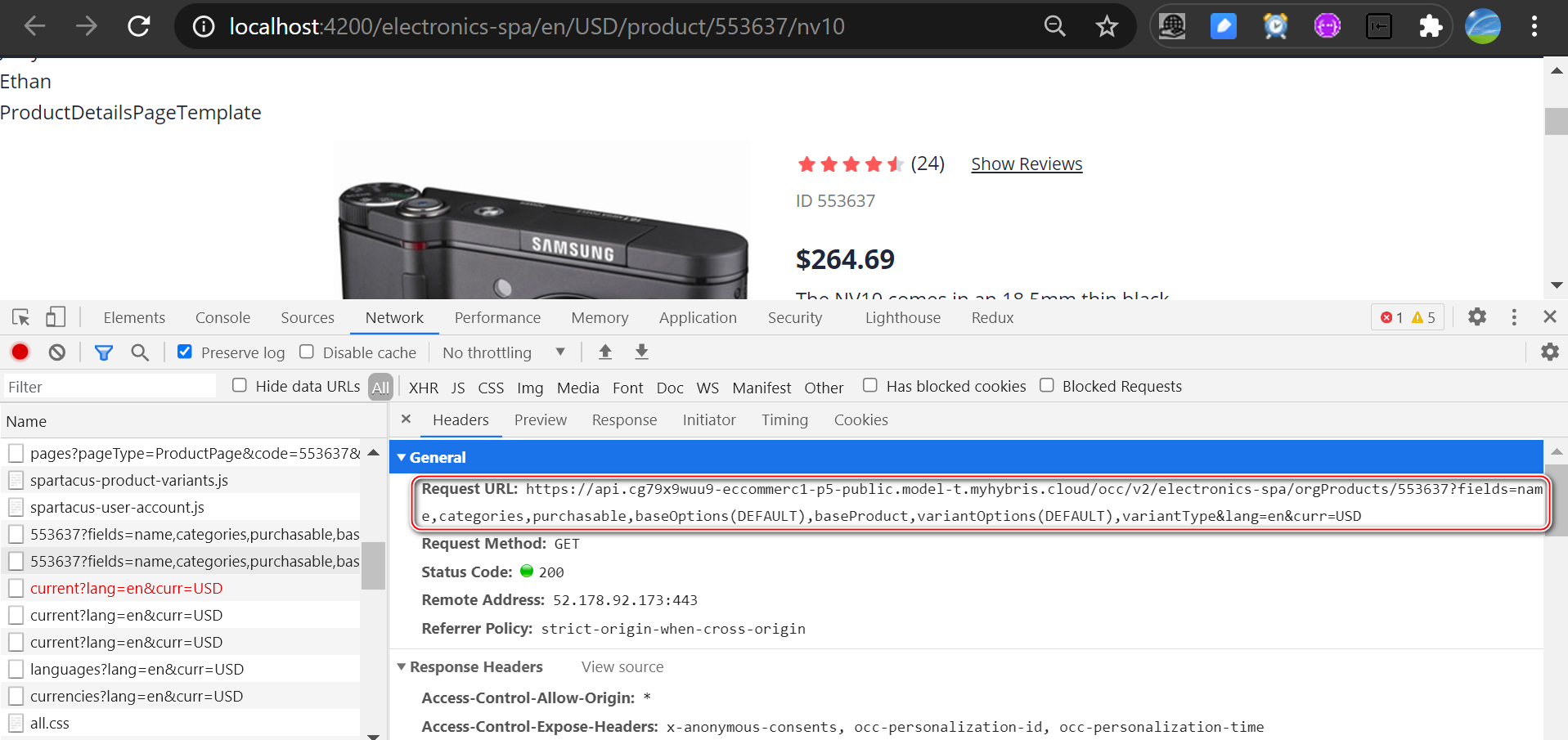 然后看到第一个和该产品信息相关的 HTTP 请求:/occ/v2/electronics-spa/orgProducts/553637?fields=name,categories,purchasable,baseOptions(DEFAULT),baseProduct,variantOptions(DEFAULT),variantType&lang=en&curr=USD