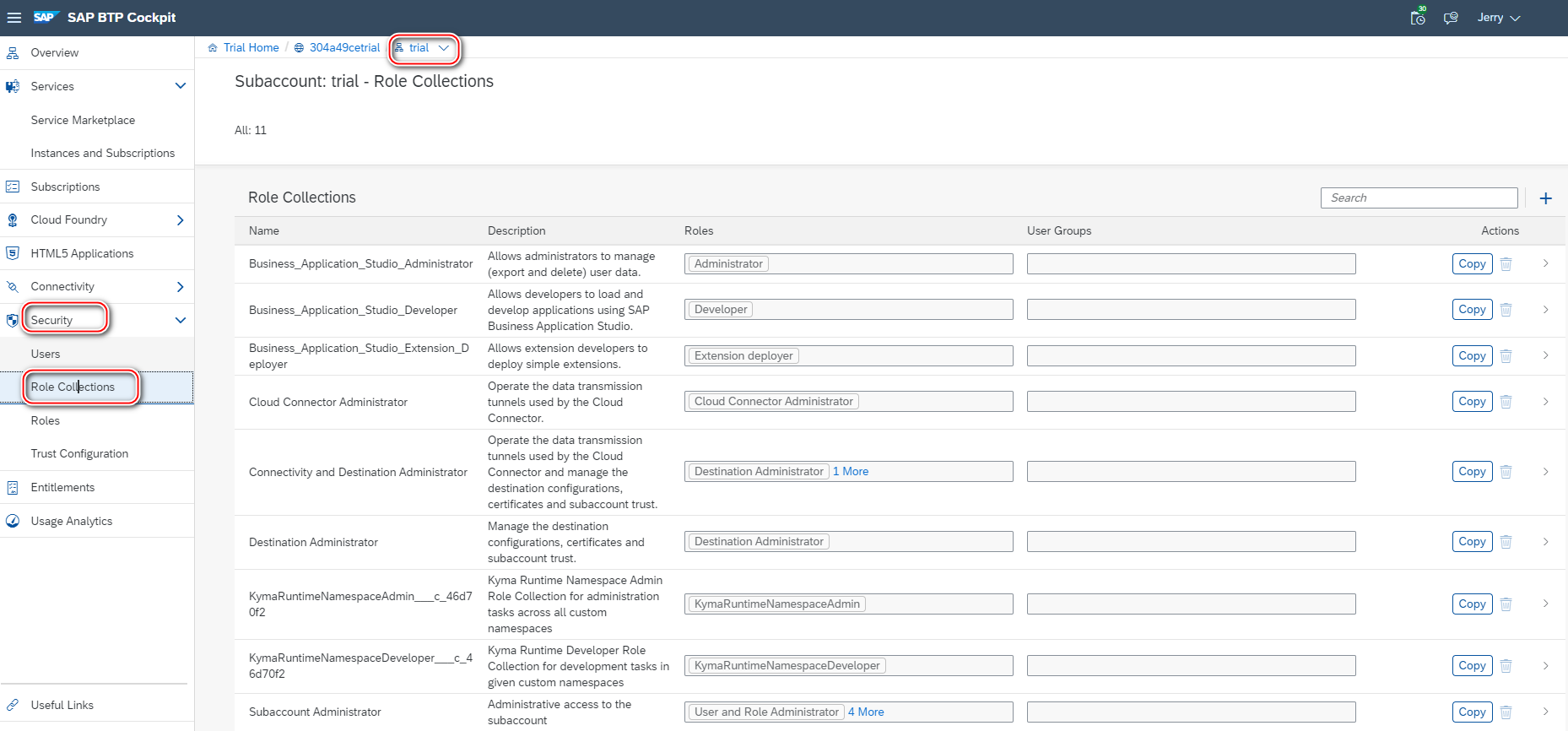 这个错误的根源是我操作的用户 Jerry,缺少打开 dashboard 必需的权限。进入 subaccount 的 security 选项: