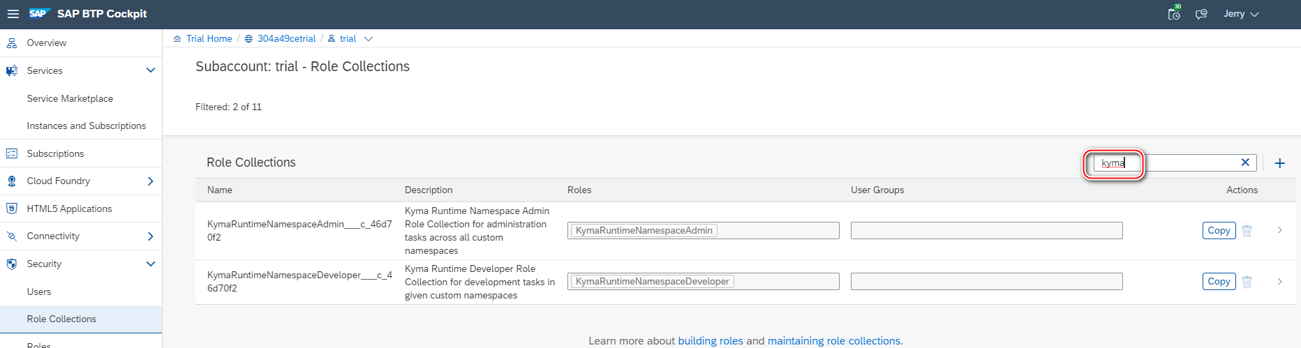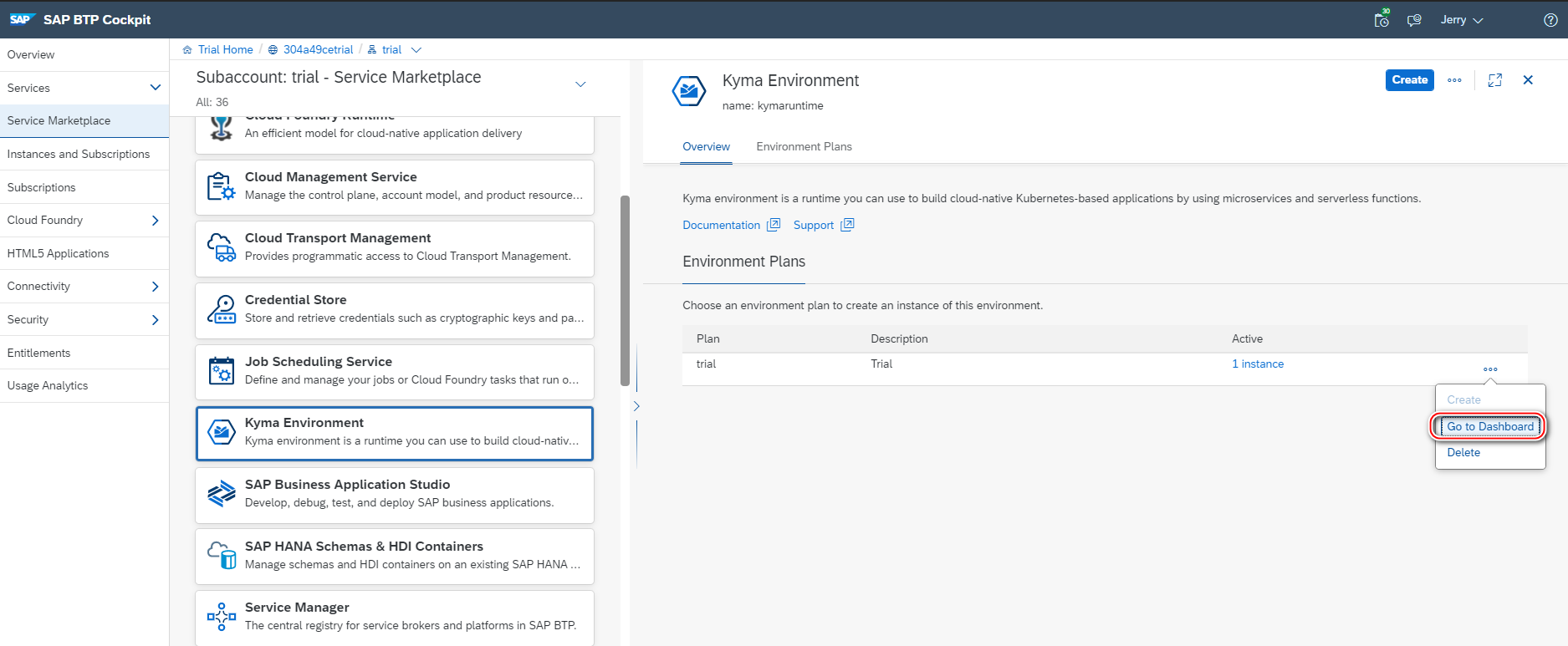 登录 SAP BTP 测试帐号,确保 Entitlements->Service Assignments 下有一个 Kyma runtime,类型为 trial environment: