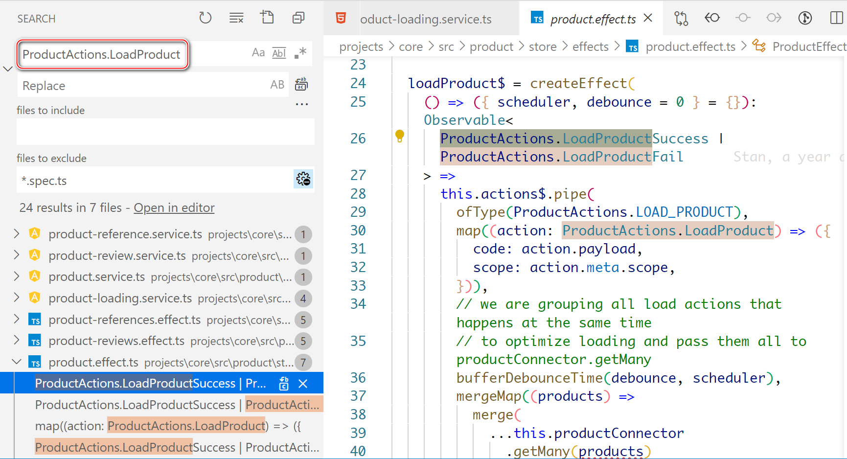 根据关键字 ProductActions.LoadProduct 搜索,即可找到处理这个 action 的 effect 实现:product.effect.ts 文件: