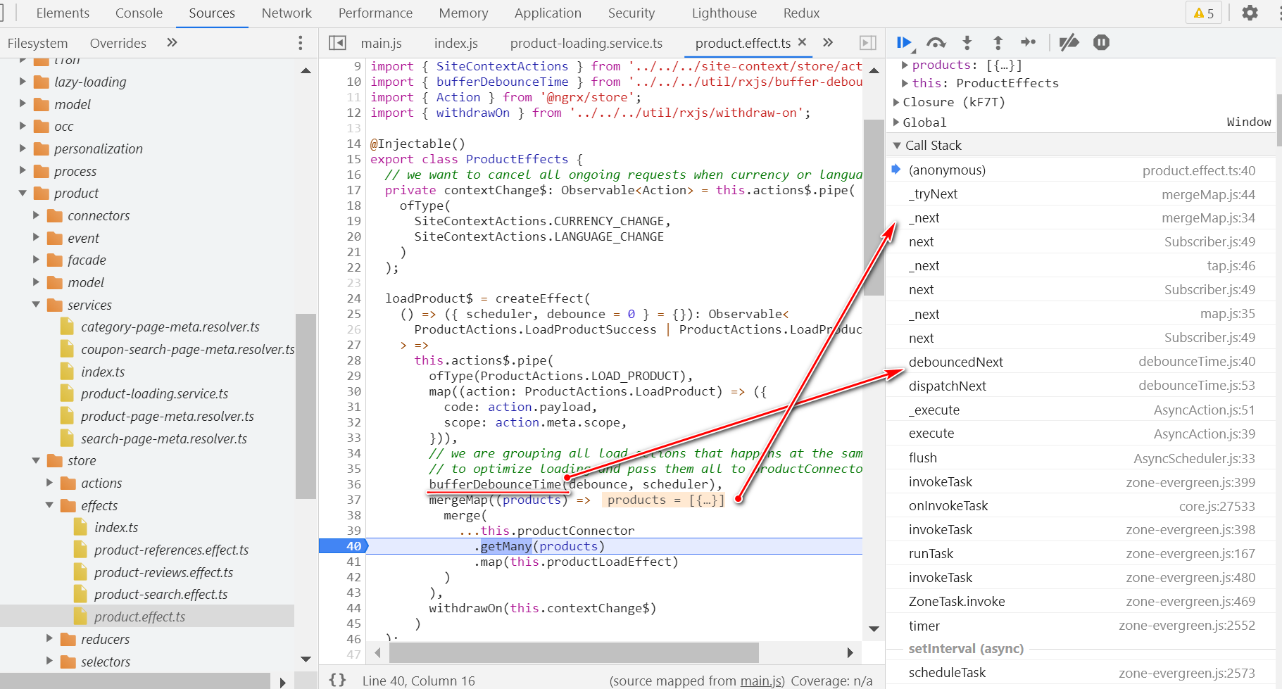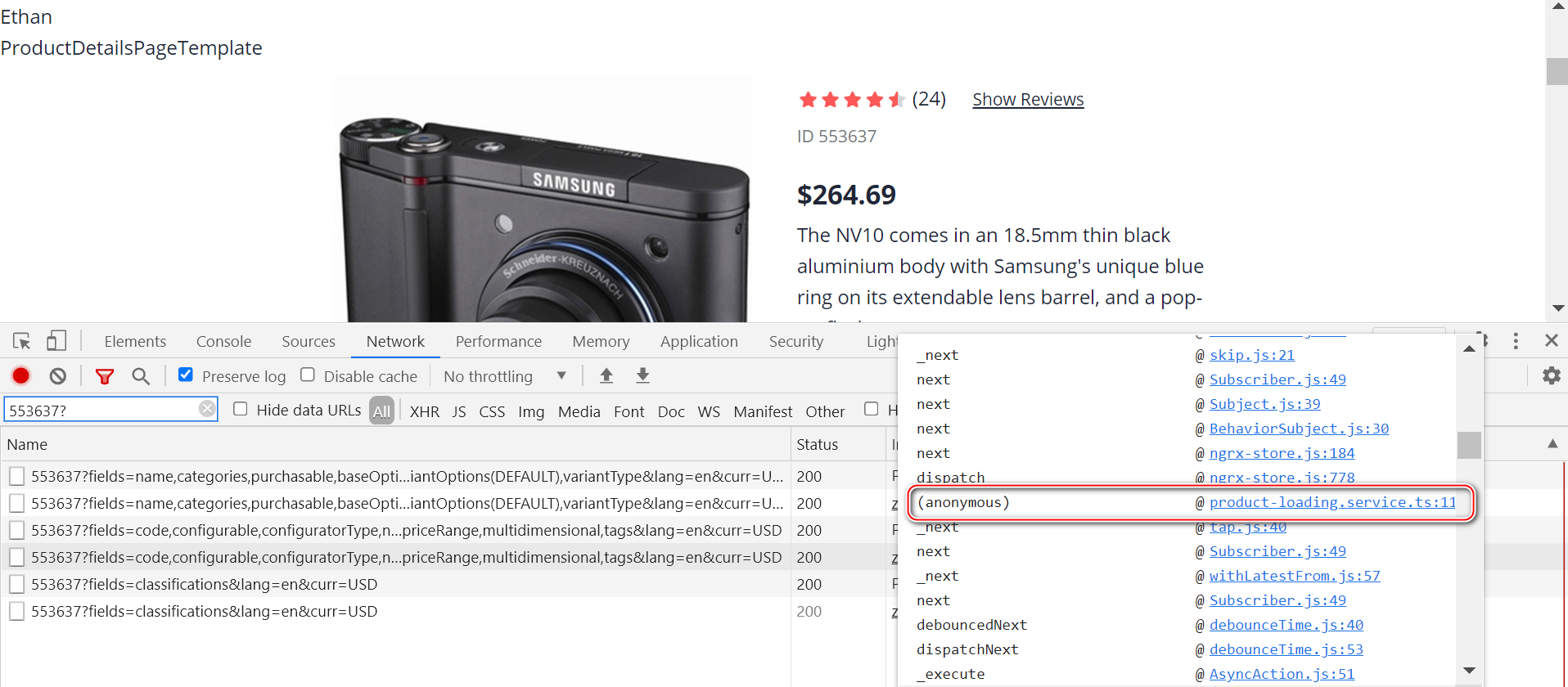 耐心往下浏览调用栈列表,直至找到 product-loading.service.ts:
