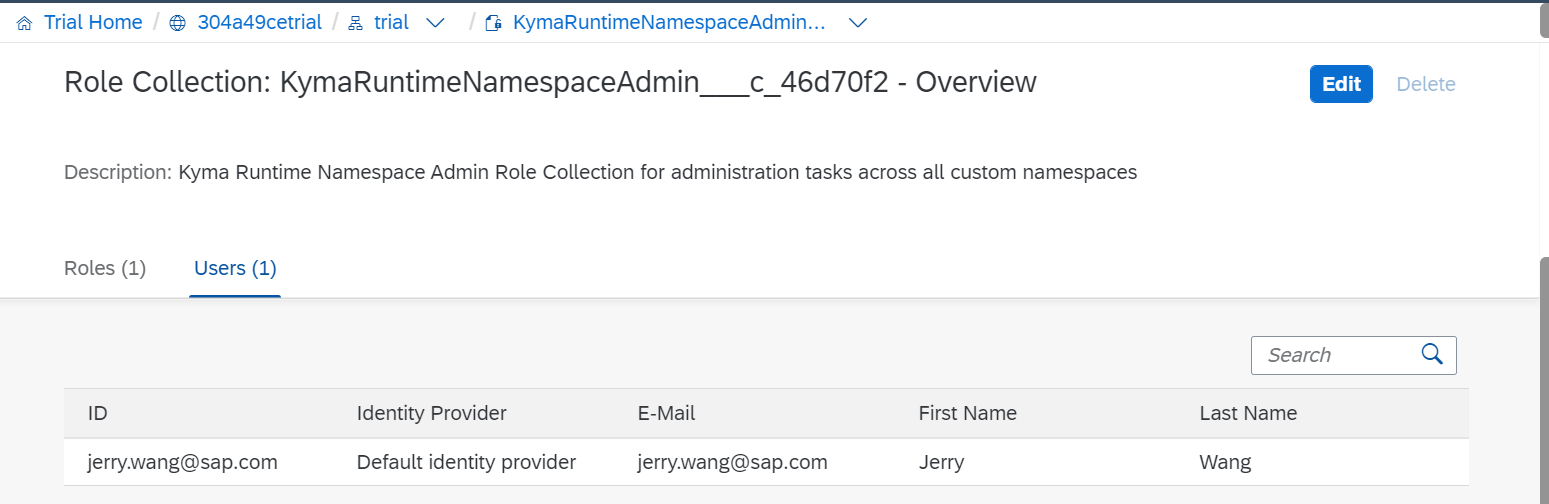 假设我期望将自己的用户 Jerry Wang 分配给角色 KymaRuntimeNamespaceAdmin,在ID 字段里输入自己的邮箱地址: