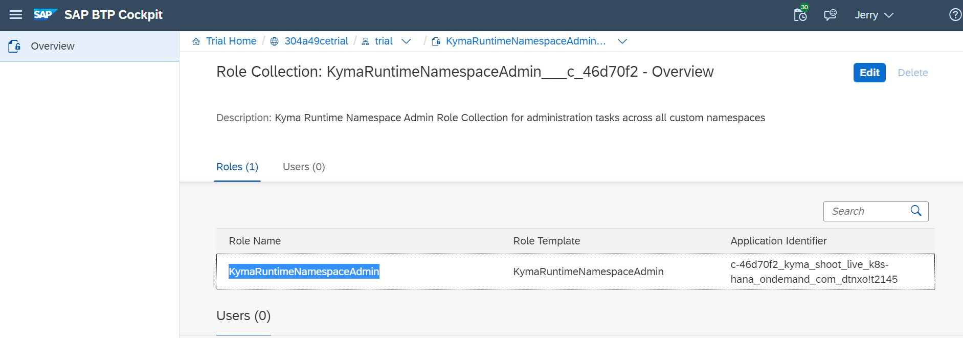 选中角色(Role) KymaRuntimeNamespaceAdmin 进入明细页面。点击 Edit 按钮: