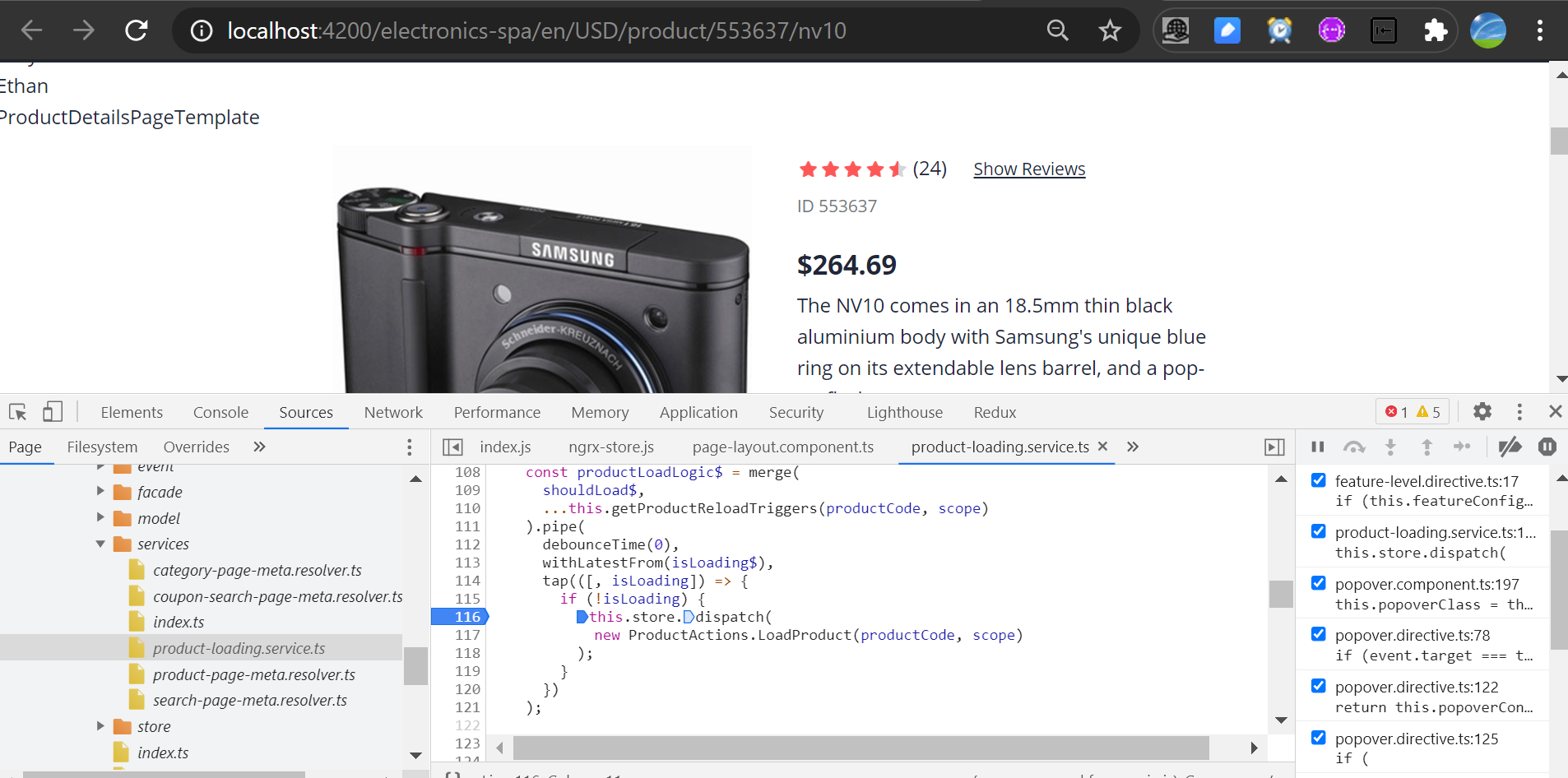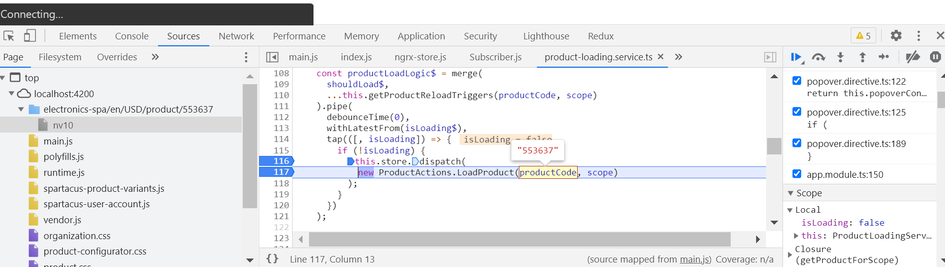 单击该文件,自动跳转到第116行,设置一个断点,按 F5 刷新, 断点触发。第 117 行代码,发送了一个新的 action 到 ngrx Store,类型为:ProductActions.LoadProduct: