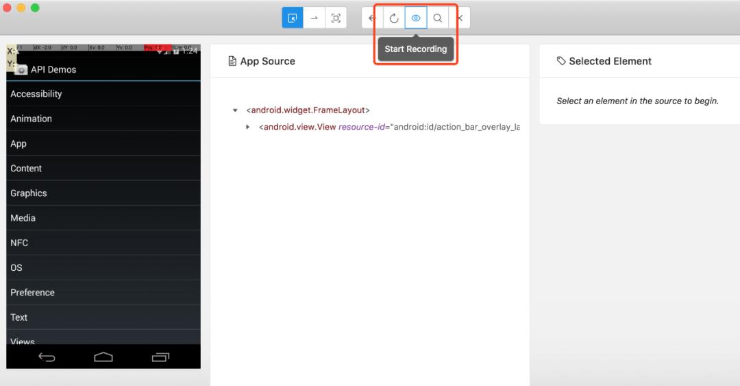 Appium Inspect 提供了定位元素与录制用例的功能,使用 Appium Inspect 可以查看移动设备的 UI 布局结构,方便脚本的编写和生成。下面以 Android 系统为例。在 Android 模拟器上安装 ApiDemos-debug.apk 应用。