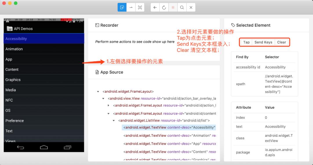 Tap 为点击元素 Send keys 为文本框录入 Clear 为清空文本框