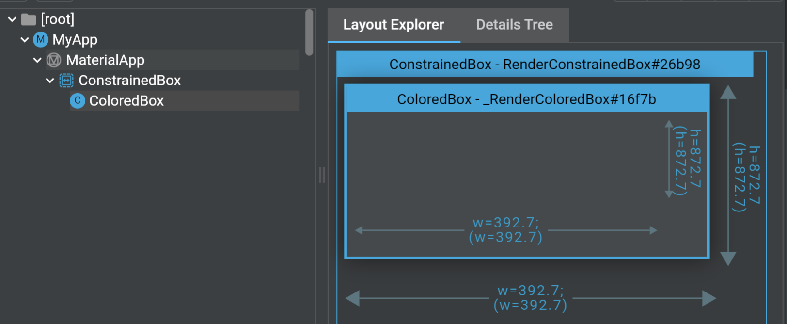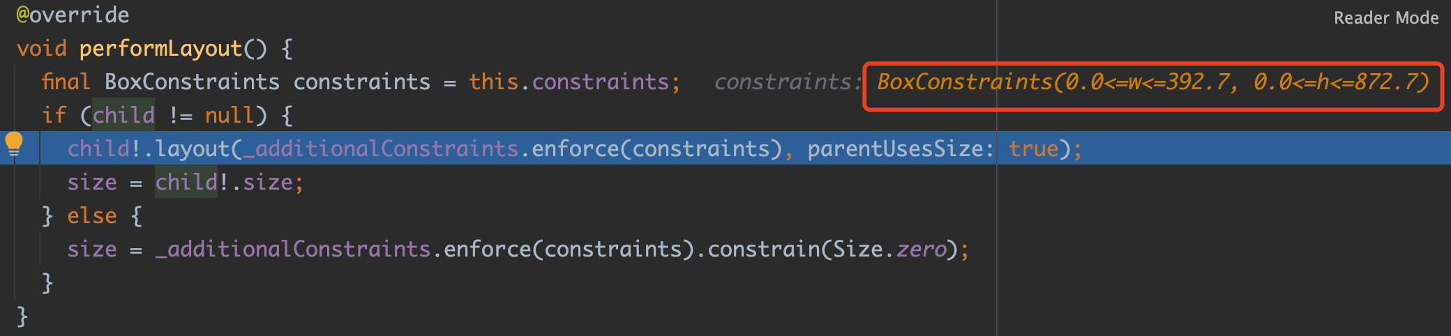 我们通过 Flutter 的调试工具可以看到,此时上级给你的约束就是屏幕大小,没有区间,而 enforce 等于 10.clamp(392.72, 392.72)
