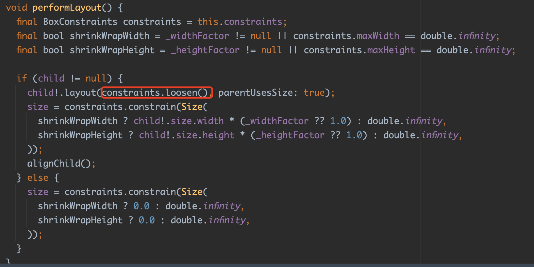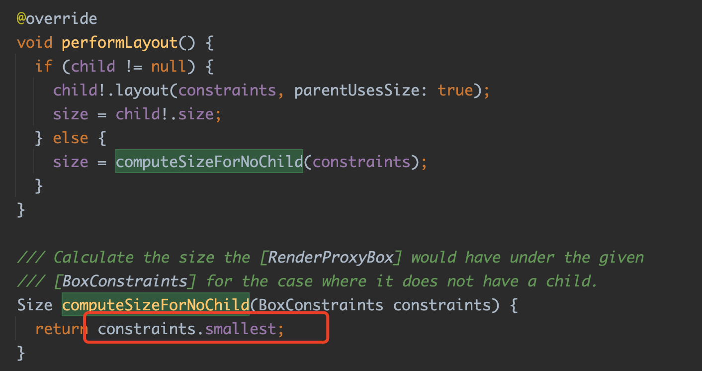 所以我们知道了,当控件没有实现自定义的 performLayout 时,并且没有 child 时,它很可能就是跟着父级约束的 smallest 走。