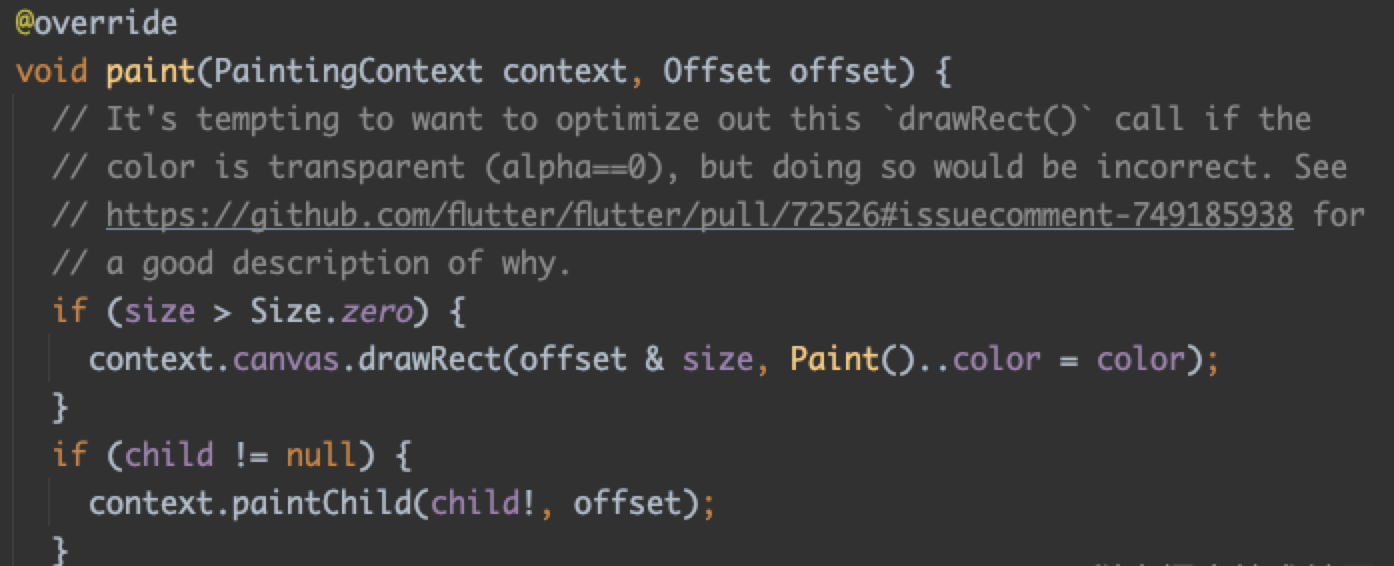 首先 ColoredBox 并没有实现自己的 performLayout,而是通过继承了 RenderProxyBox 默认的逻辑来实现,这种情况在 Flutter 里比较常见,可以看到默认 RenderProxyBox 下: