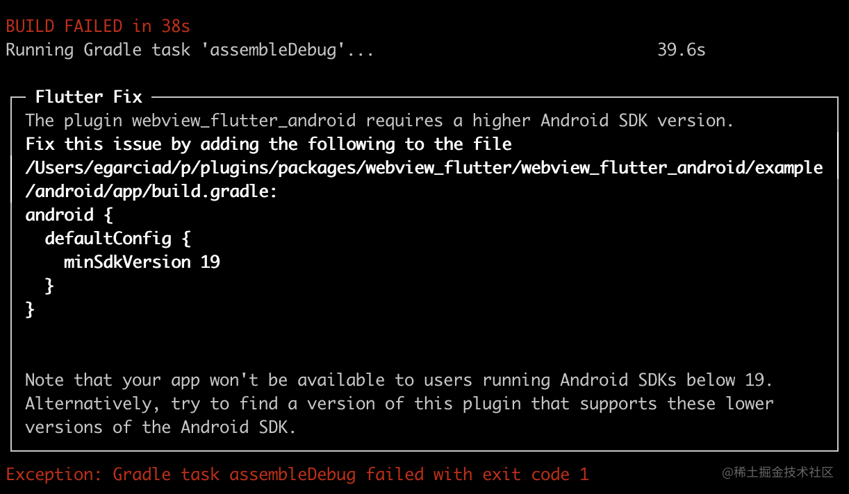 最后,Flutter 工具现在会在 Gradle 发生错误时提供常见的问题解决步骤,例如如果在应用中添加了一个插件,需要你提高最低 Android SDK 版本时,你现在会在日志中看到 “Flutter Fix” 建议。