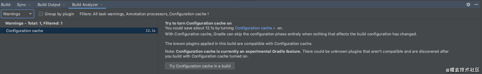 Build Analyzer现在可识别项目何时未启用配置缓存,并将其作为优化提供。Build Analyzer 运行兼容性评估,以在启用之前通知项目中的配置缓存是否存在任何问题。