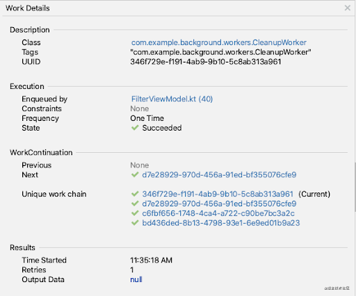 你可以通过单击 worker 查看更多详细信息,例如可以看到 worker 的描述,它是如何执行的,它的 worker 链的细节,以及执行的结果。
