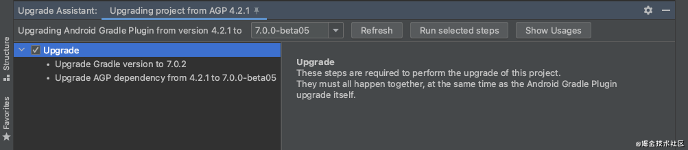 Android Gradle 插件的 升级助手 现在有一个持久的工具窗口,其中包含将要完成的步骤列表。
