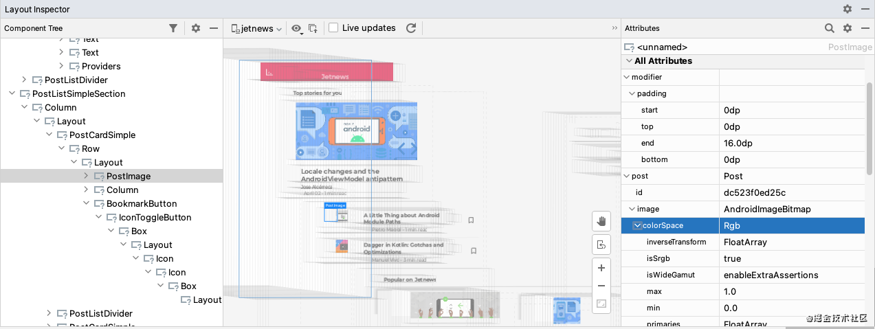 开发者可以检查使用新的 Android 声明式 UI 框架 Jetpack Compose 编写的布局,无论应用程序使用完全由 Compose 编写的布局,还是使用 Compose 和 Views 的混合布局,布局检查器都 可以帮助开发者了解布局在运行设备上的呈现方式。