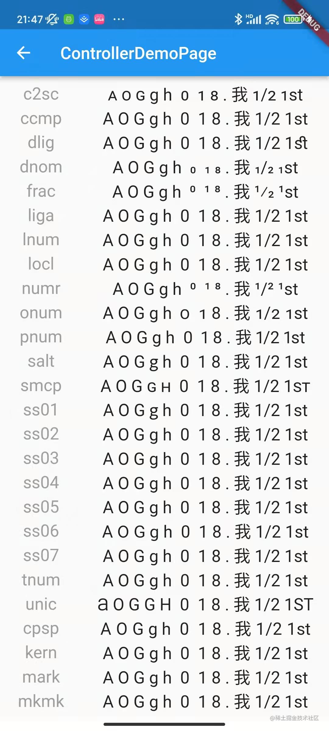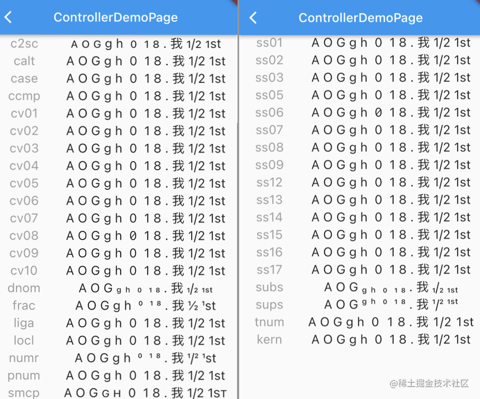 回归到 FontFeature 上,那 Roboto 自己默认支持多少种 features 呢? 答案是 26 种,它们的编码如下所示,运行后效果也如下图所示,从日常使用上看,这 26 种 Feature 基本满足开发的大部分需求。