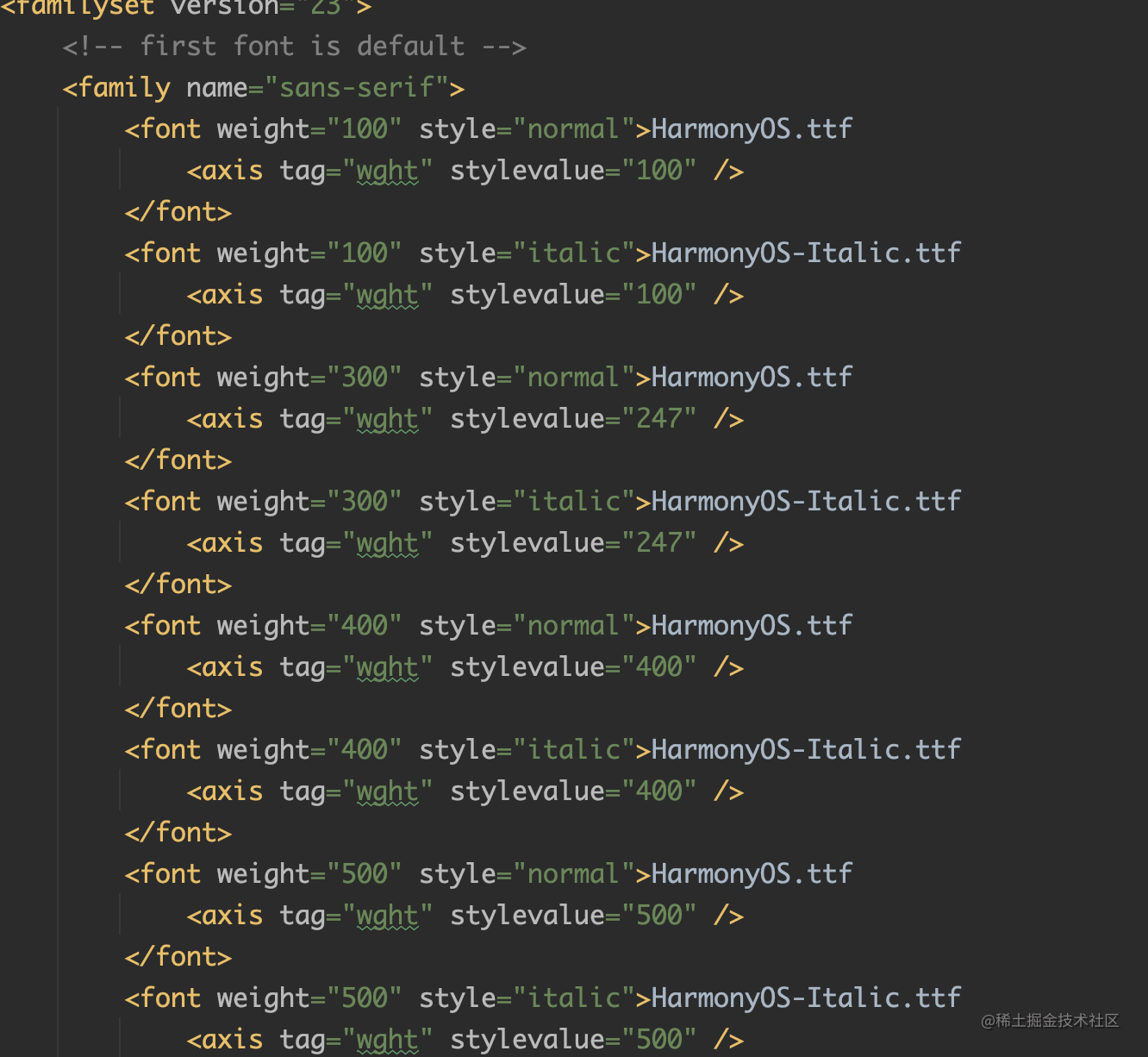 这里可以用 Android Studio 的 Device File Explorer 查看/system/etc/fonts.xml 下当前手机的字体编码情况,右键该文件 save as 到电脑上,下图是华为上的 fonts.xml 截图: