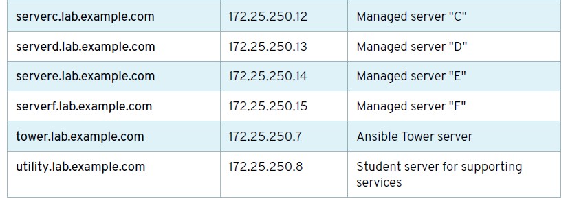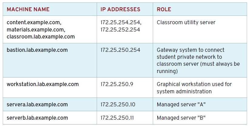 教室里的几个系统提供支持服务。两个服务器, content.example.com 和materials.example.com是用于实践练习的软件和实验材料的来源。关于如何使用这些服务器的信息在这些活动的说明中提供。这些都是classroom.example.com虚拟机提供的。classroom和bastion应始终运行,以正确使用实验室环境。