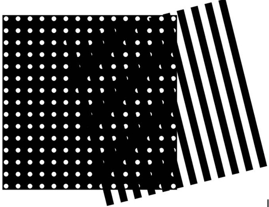 白色圆点代表采样点,黑色条纹代表被采样的图像,在两者的叠加部分,可以清晰地看到数条较粗的条纹,这些条纹称为摩尔纹。
