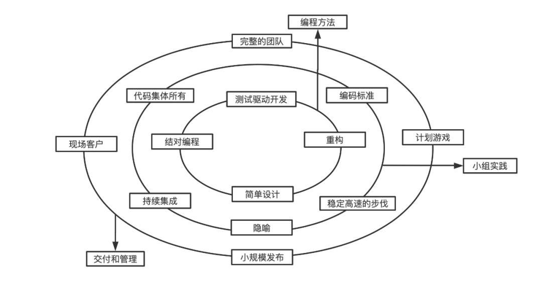 在上图中可以看出,极限编程是从 3 个维度去组织开发流程的。