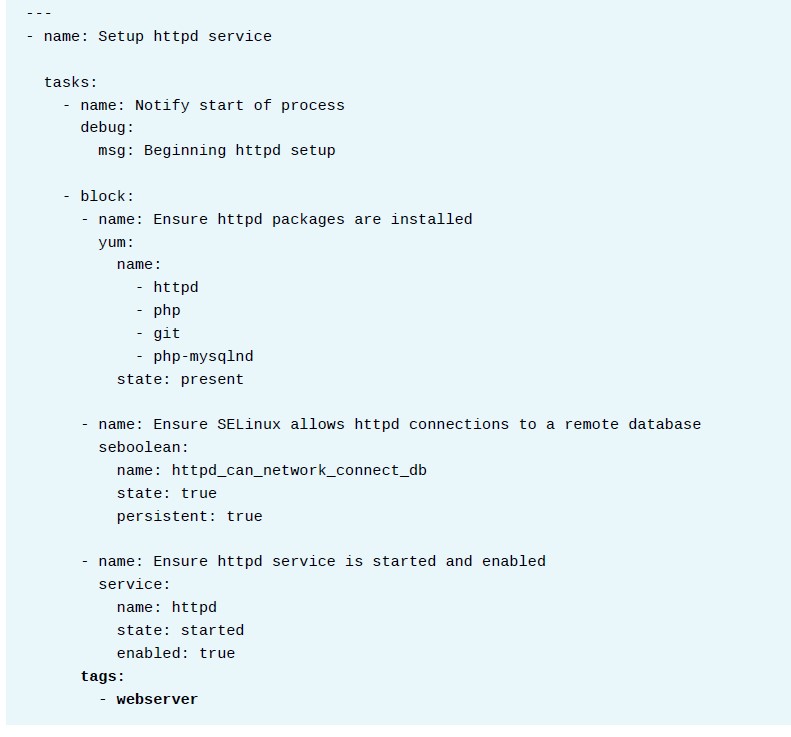 标记一个任务块。块中的所有任务都与这个标记相关联。在本例中,我们将所有与httpd相关的任务分组在webserver标记下。