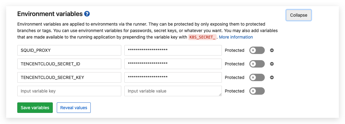 - 使用gitlab ci 环境管理来对执行ci/cd的人员隐藏密钥信息。