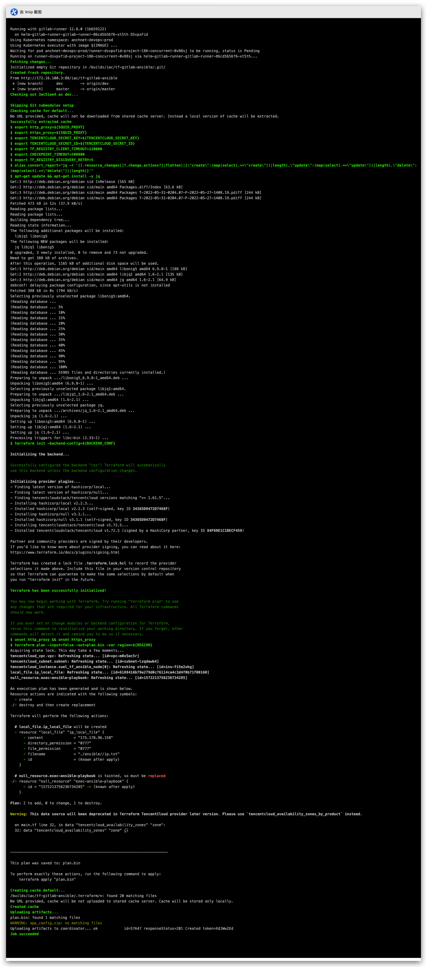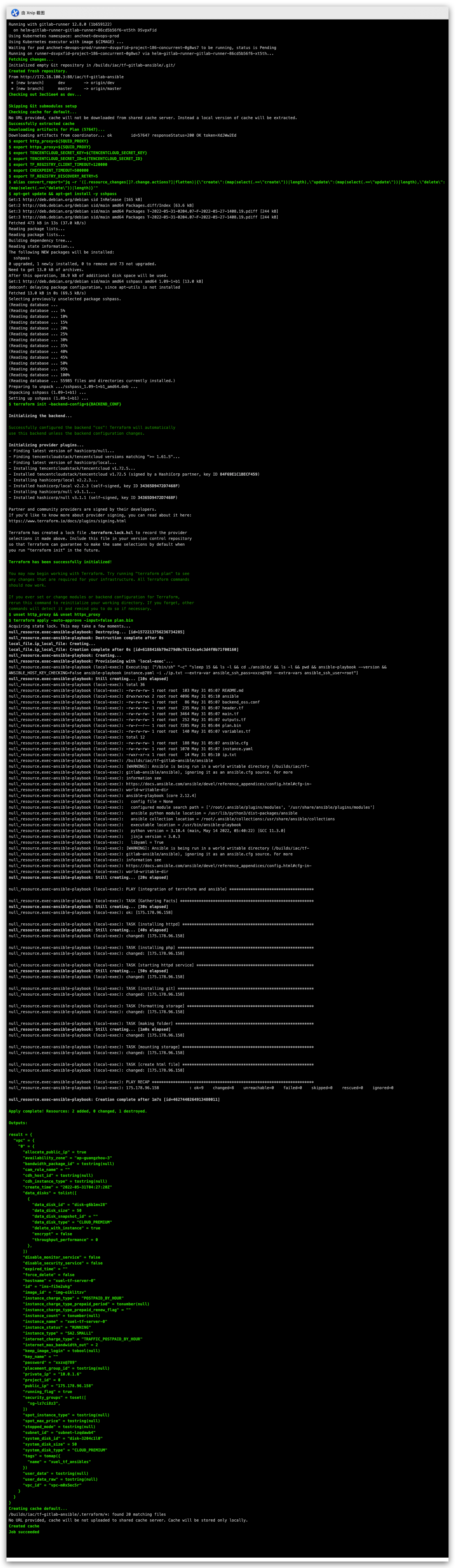 2.部署在对应名称空间下的runner执行流程,创建运行单个Stage的POD来运行Terraform对应命令,例如init/fmt/play/apply等,同时在云上资源编排完成后,会进行利用Ansible对编排出来的主机进行SSH登录并进行内部配置管理。