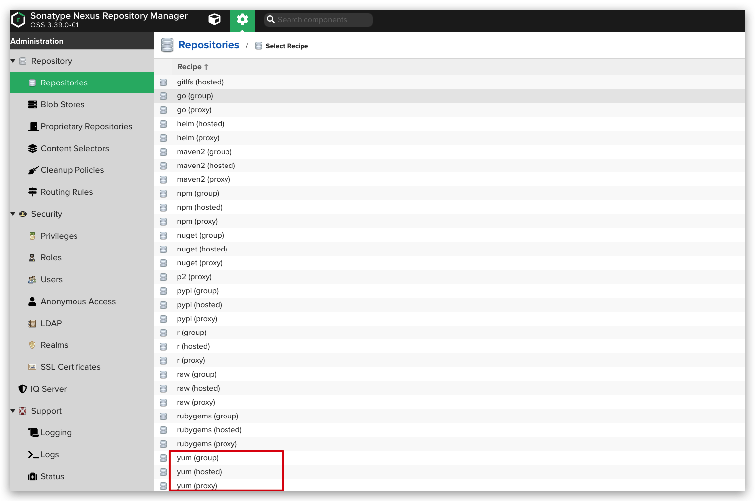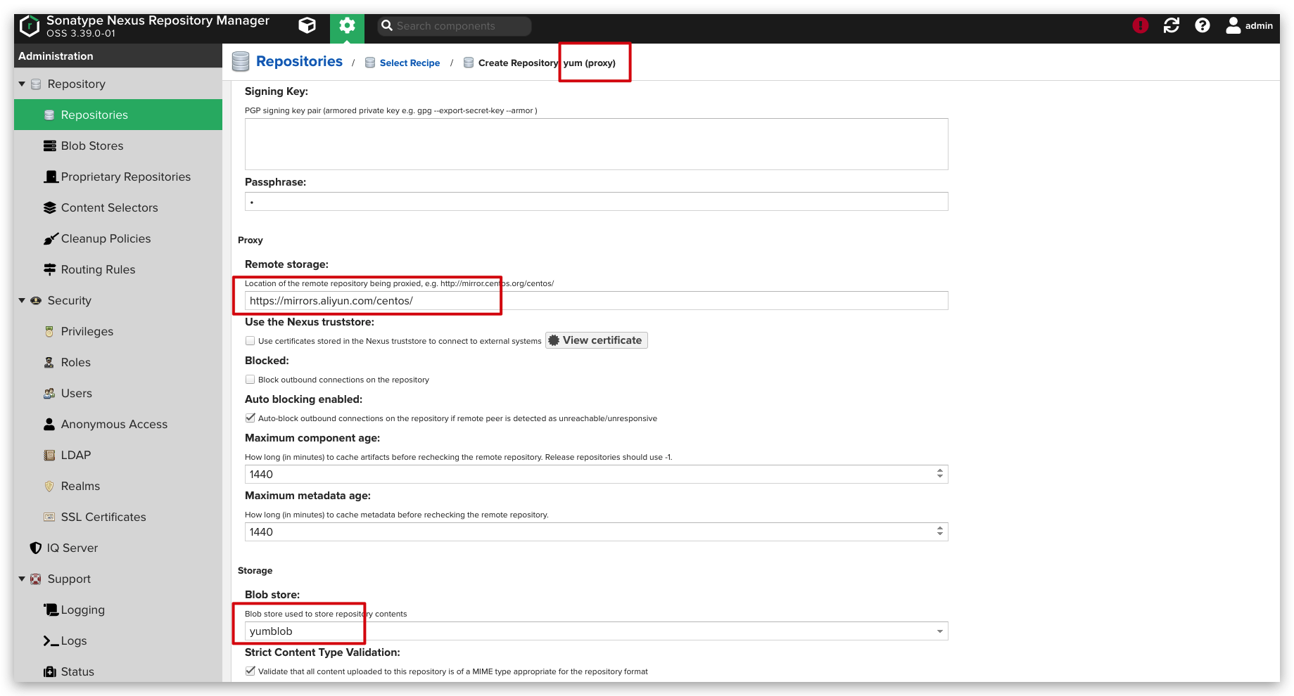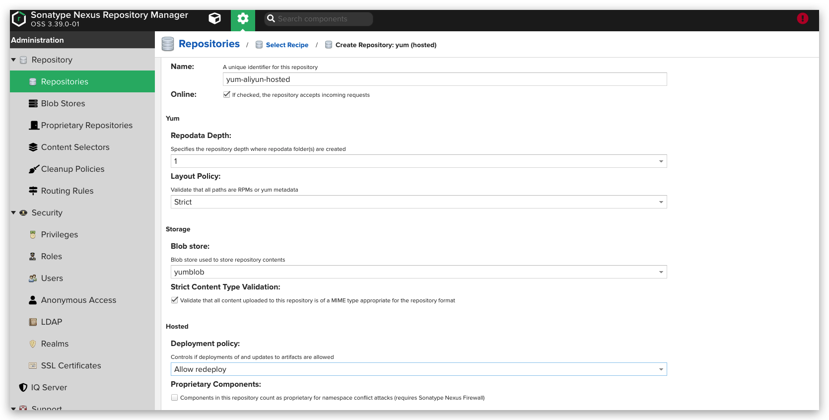 2. 创建仓库[三种类型:hosted(自建yum)、proxy(代理阿里yum、163yum等)、group(透明代理,将hosted和proxy组合)]