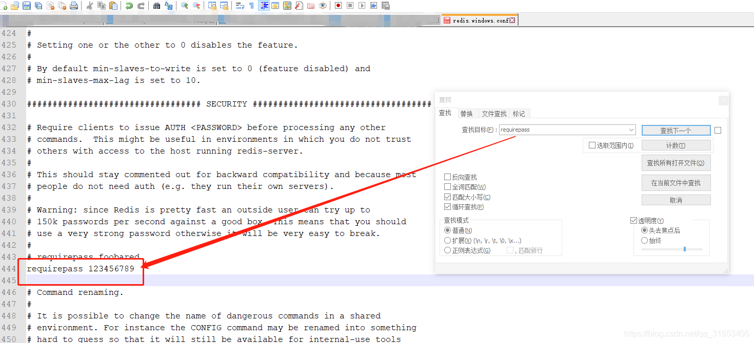 安装成功之后,进入这个文件修改用户名,密码【redis.windows.conf】 用notepad++打开,按 Ctrl+f ,查找requirepass这个参数,设置密码: