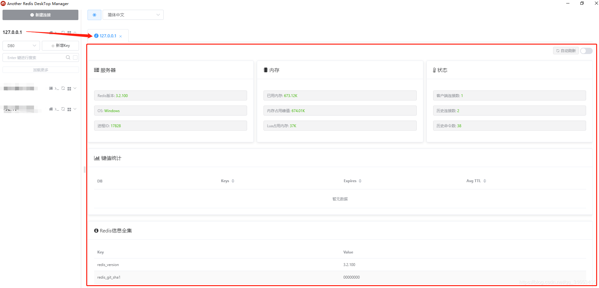 成功启动后,用工具连接redis服务,进行项目的使用: