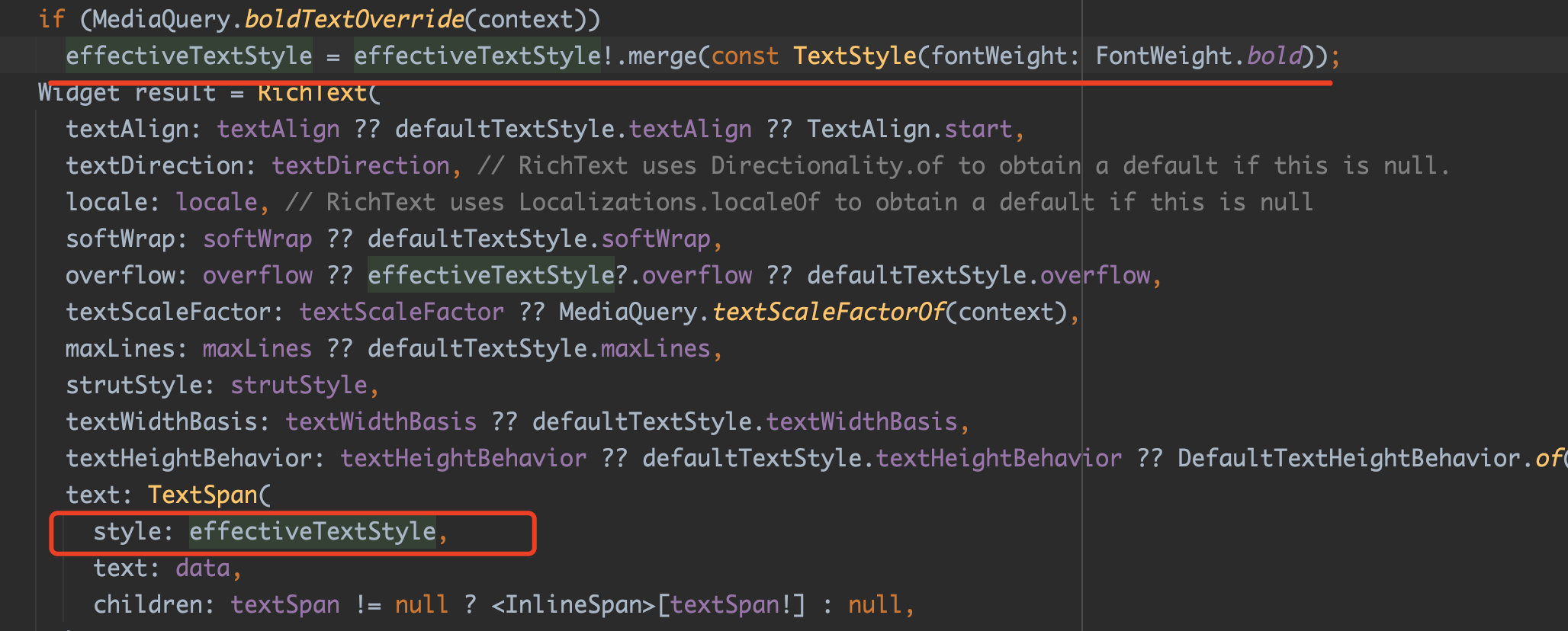 因为在 Text 内使用了 MediaQuery.boldTextOverride 判断,Flutter 会接收到 iOS 上用户开启了 Bold Text ,从而强行将 fontWeight 设置为 FontWeight.bold ,当然如果你直接使用 RichText 就 没有这一行为。