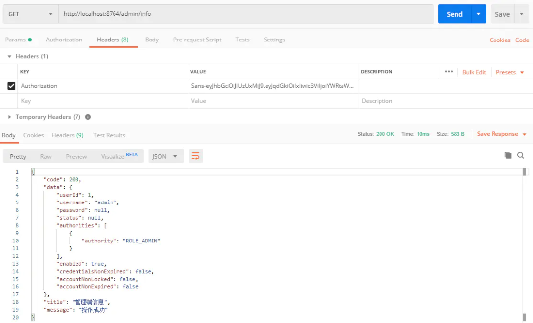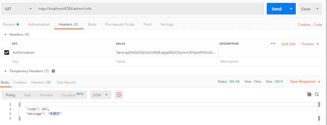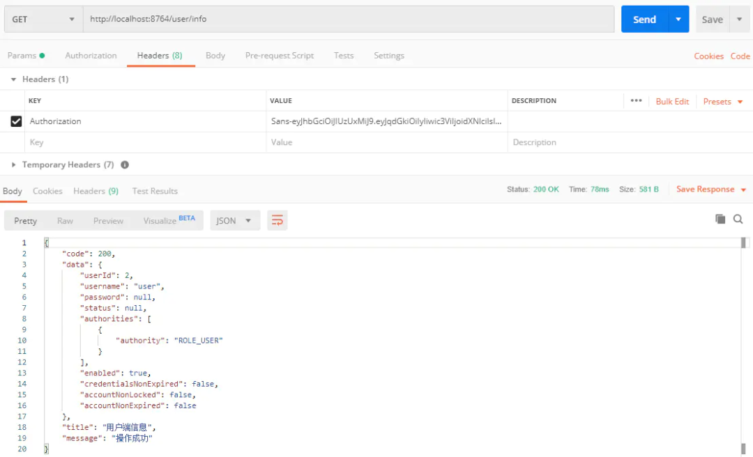 访问USER角色的接口,把上一步获取到的Token设置在Headers中,Key为Authorization,我们之前实现的JWTAuthenticationTokenFilter拦截器会根据请求头中的Authorization获取并解析Token
