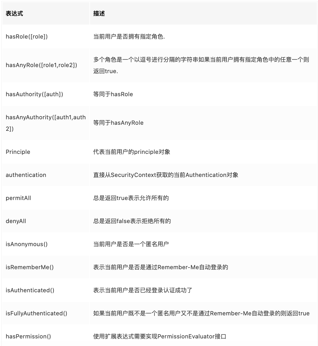 Security允许我们在定义URL方法访问所应有的注解权限时使用SpringEL表达式,在定义所需的访问权限时如果对应的表达式返回结果为true则表示拥有对应的权限,反之则没有权限,会进入到我们配置的UserAuthAccessDeniedHandler(暂无权限处理类)中进行处理.这里举一些例子,代码中注释有对应的描述。