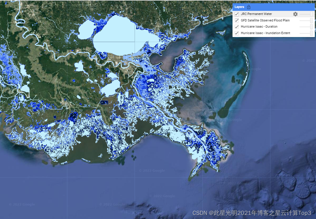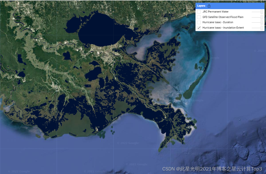 ImageCollection 中的每个图像都代表了单个洪水的地图。该集合可以按日期、国家或达特茅斯洪水观测站原始 ID 进行过滤。