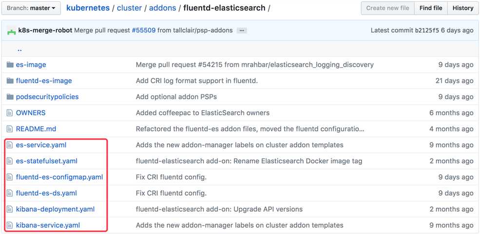 Elasticsearch 附加组件本身会作为 Kubernetes 的应用在集群里运行,其 YAML 配置文件可从 https://github.com/kubernetes/kubernetes/tree/master/cluster/addons/fluentd-elasticsearch 获取。
