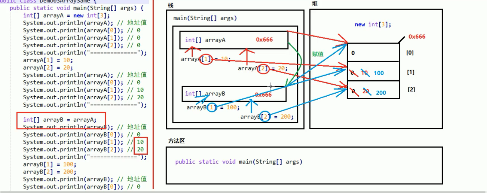 三、两个引用数据类型,两个引用名称直接赋值,就是把地址值赋值,即两个引用名称地址值相等,就是指向堆内存中的同一个对象:
