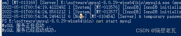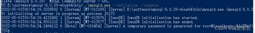 2022-05-01T00:52:29.058790Z 0 [System] [MY-013169] [Server] E:\software\mysql-8.0.29-winx64\bin\mysqld.exe (mysqld 8.0.29) initializing of server in progress as process 12912