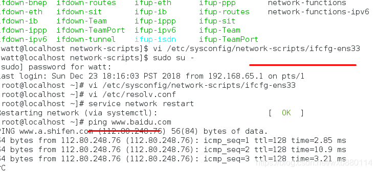 (注:这里的ens33是我电脑的网卡名称,每个人的不一定相同。要在目录下自己查看。路径:/etc/sysconfig/network-scripts/)