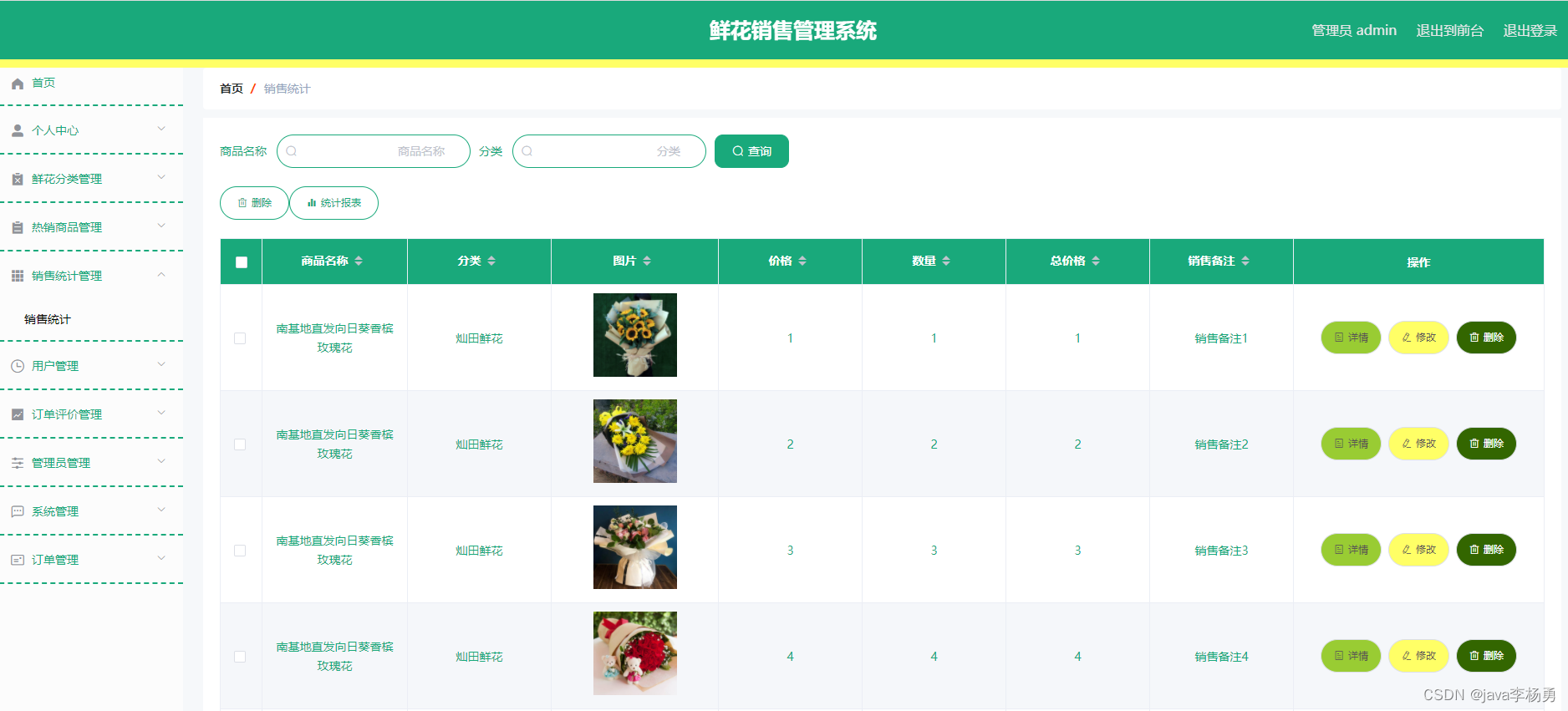 销售统计管理: 在销售统计管理页面可以查看商品名称、分类、图片、价格、数量、总价格、销售备注等信息,并可根据需要对销售统计管理进行详情,修改,删除或查看详细内容等操作