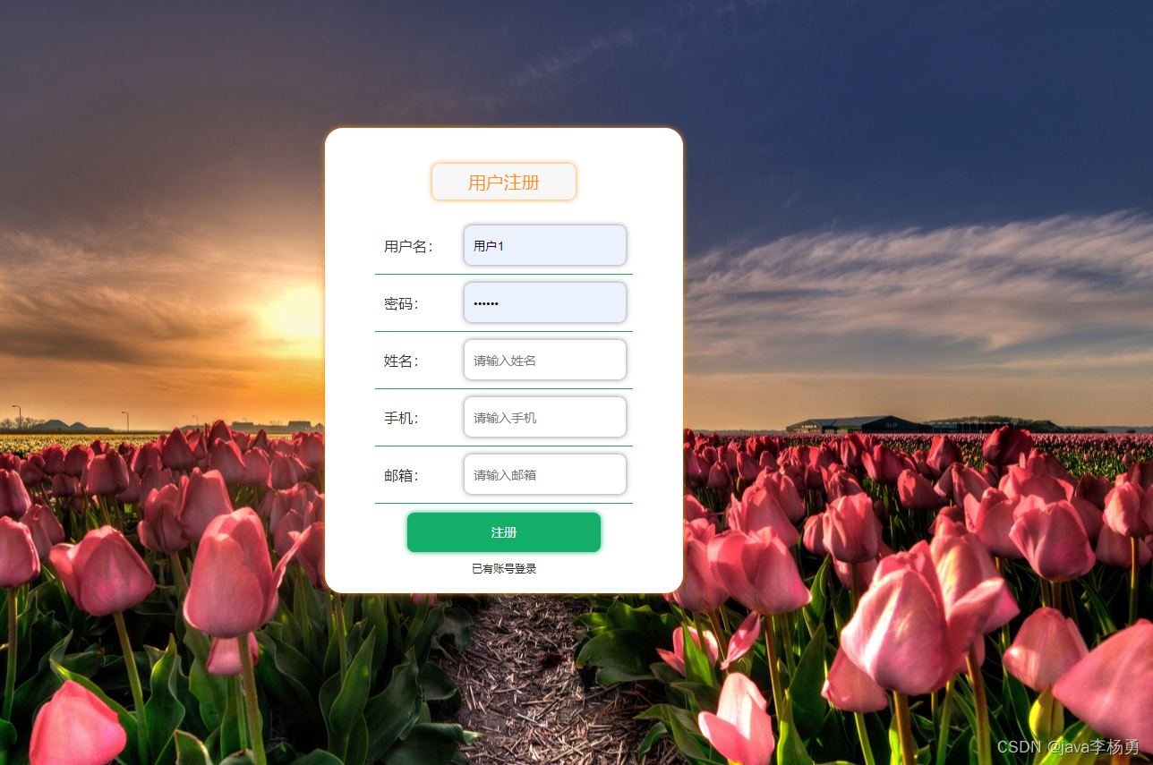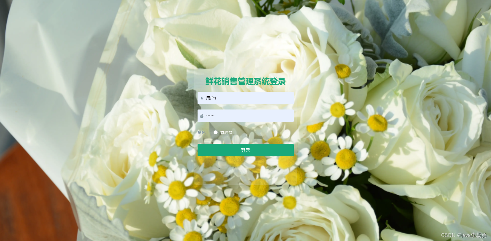 后台管理: 管理员登录,通过填写用户名、密码、角色等信息,输入完成后选择登录即可进入鲜花销售管理系统