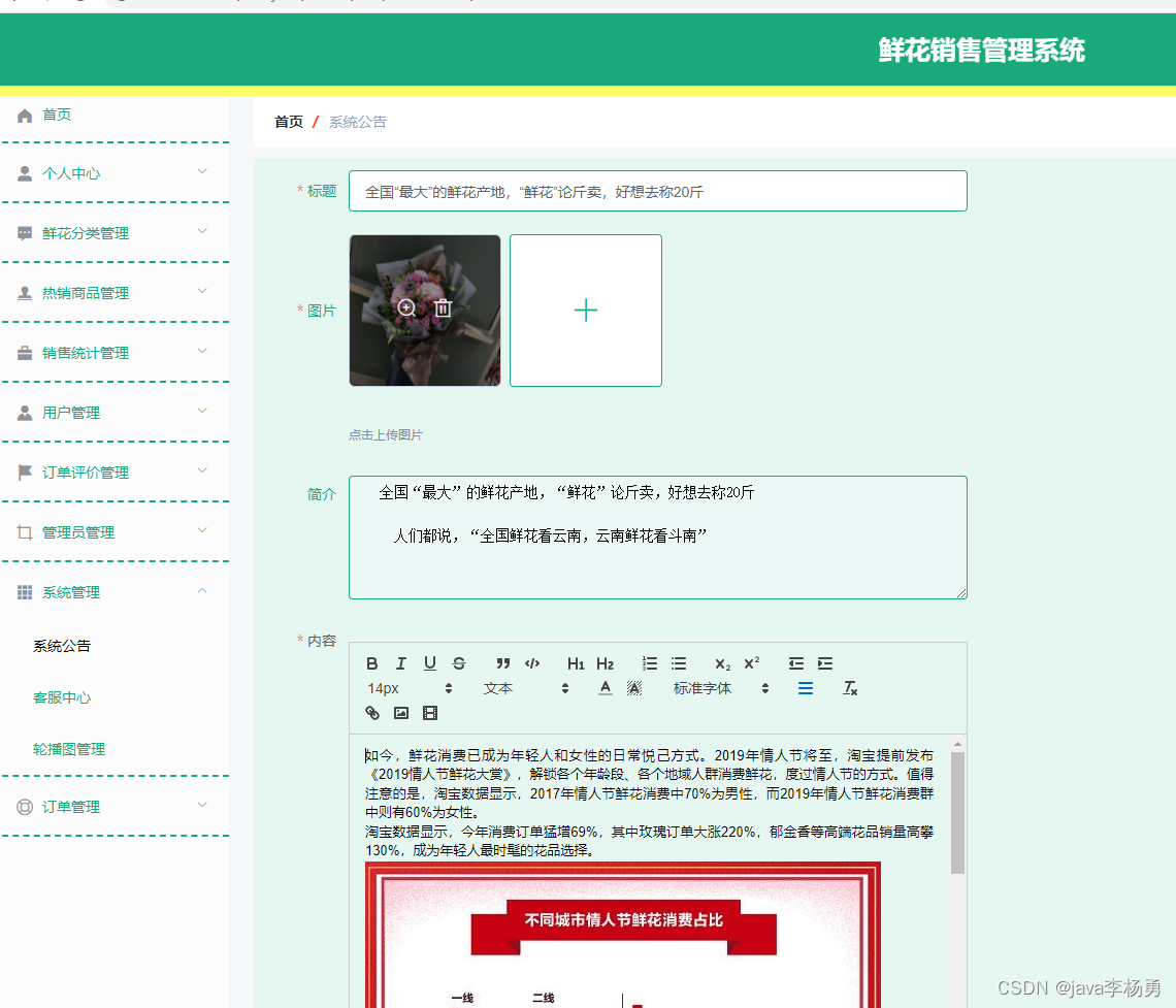 关于鲜花销售管理系统的基本要求功能要求:可以管理首页、个人中心、鲜花分类管理、热销商品管理、销售统计管理、用户管理、订单评价管理、管理员管理、系统管理、订单管理等功能模块。
