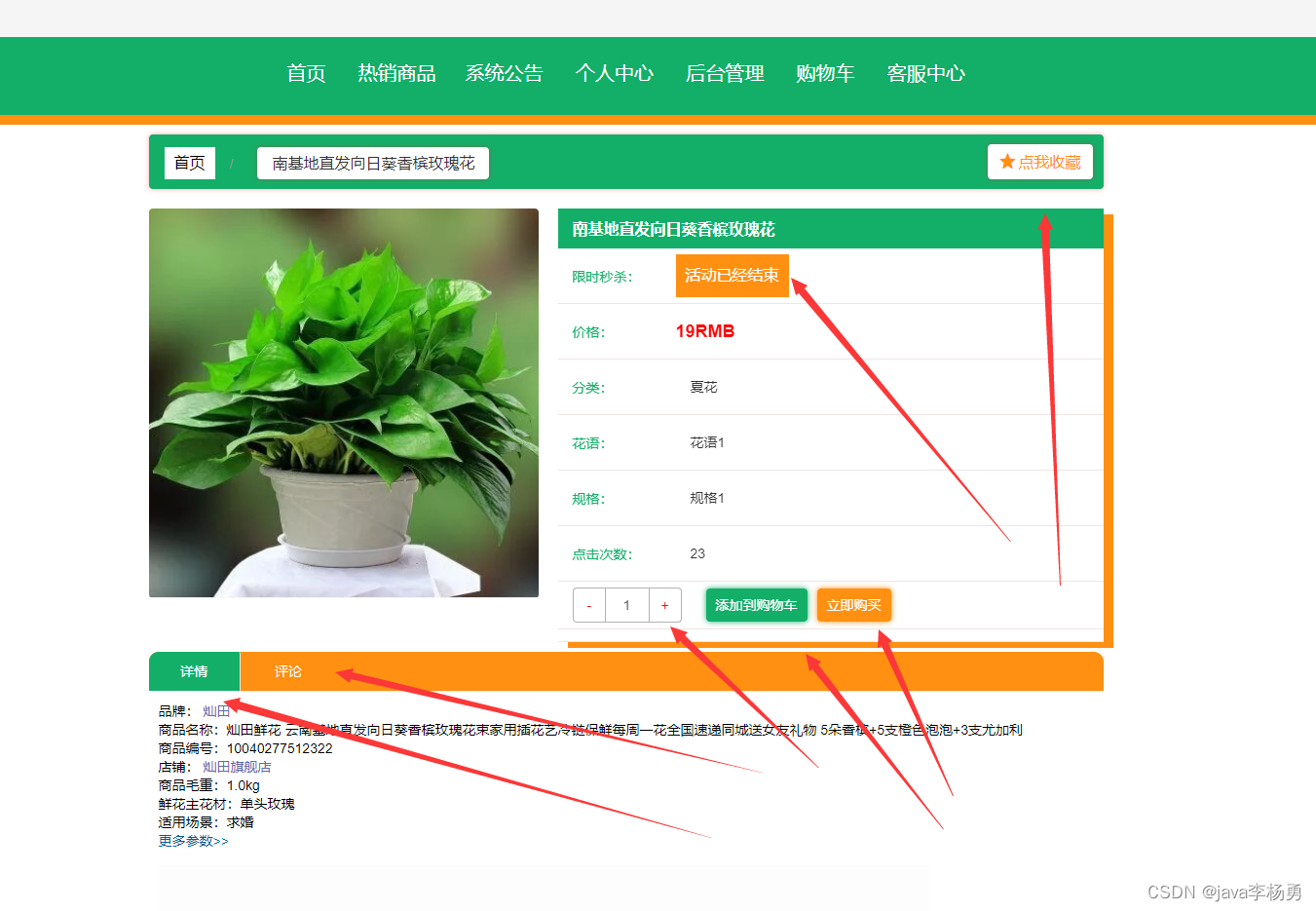 热销鲜花商品: 热销商品,在热销商品页面可以查看商品名称、分类、花语、图片、规格、价格等信息进行提交。